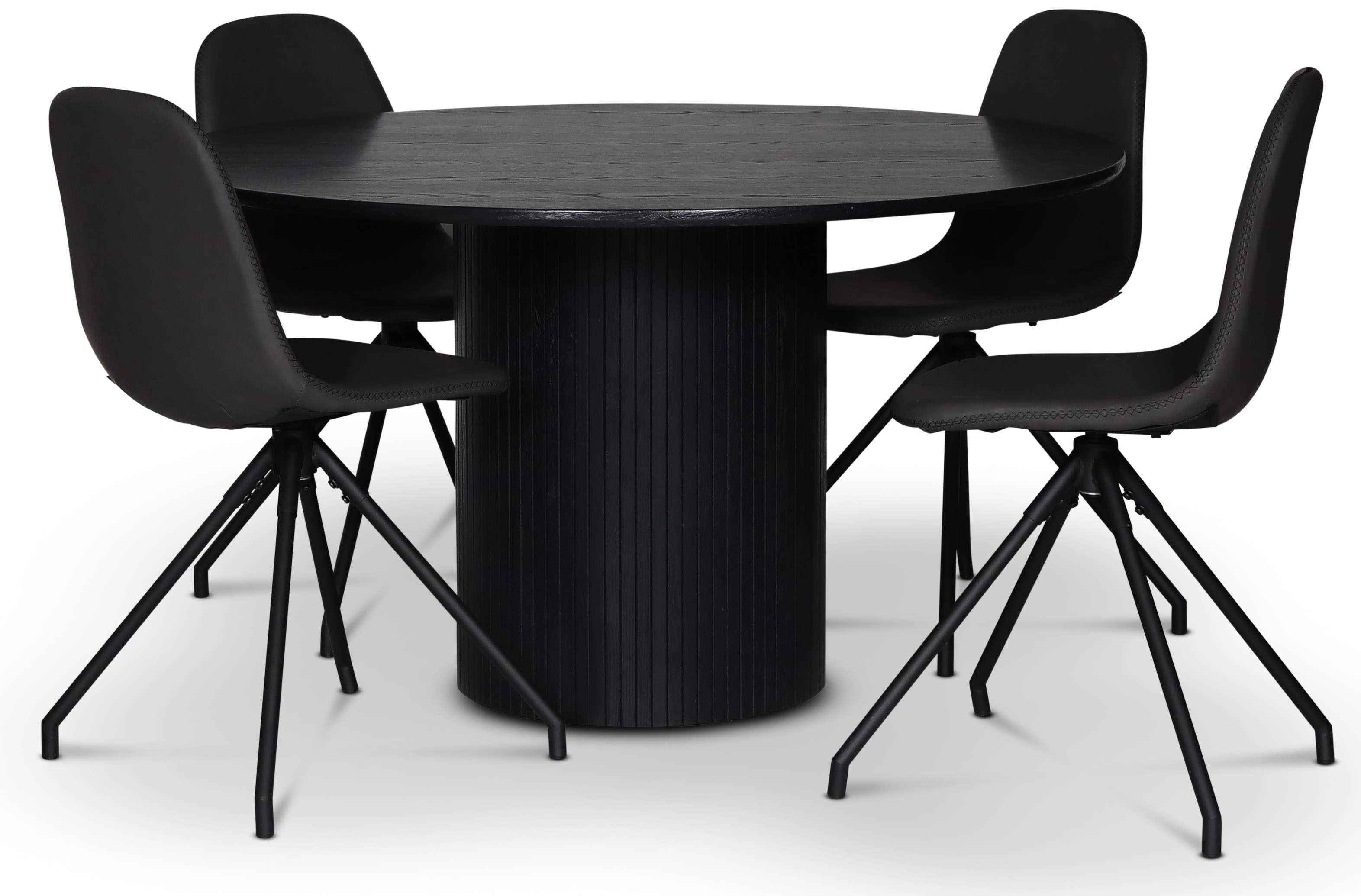 spisegruppe i Nordansjöen; rundt spisebord Ø130 cm, svartbeiset eik + 4 stk Bridge spisestoler svingbare, Svart PU
