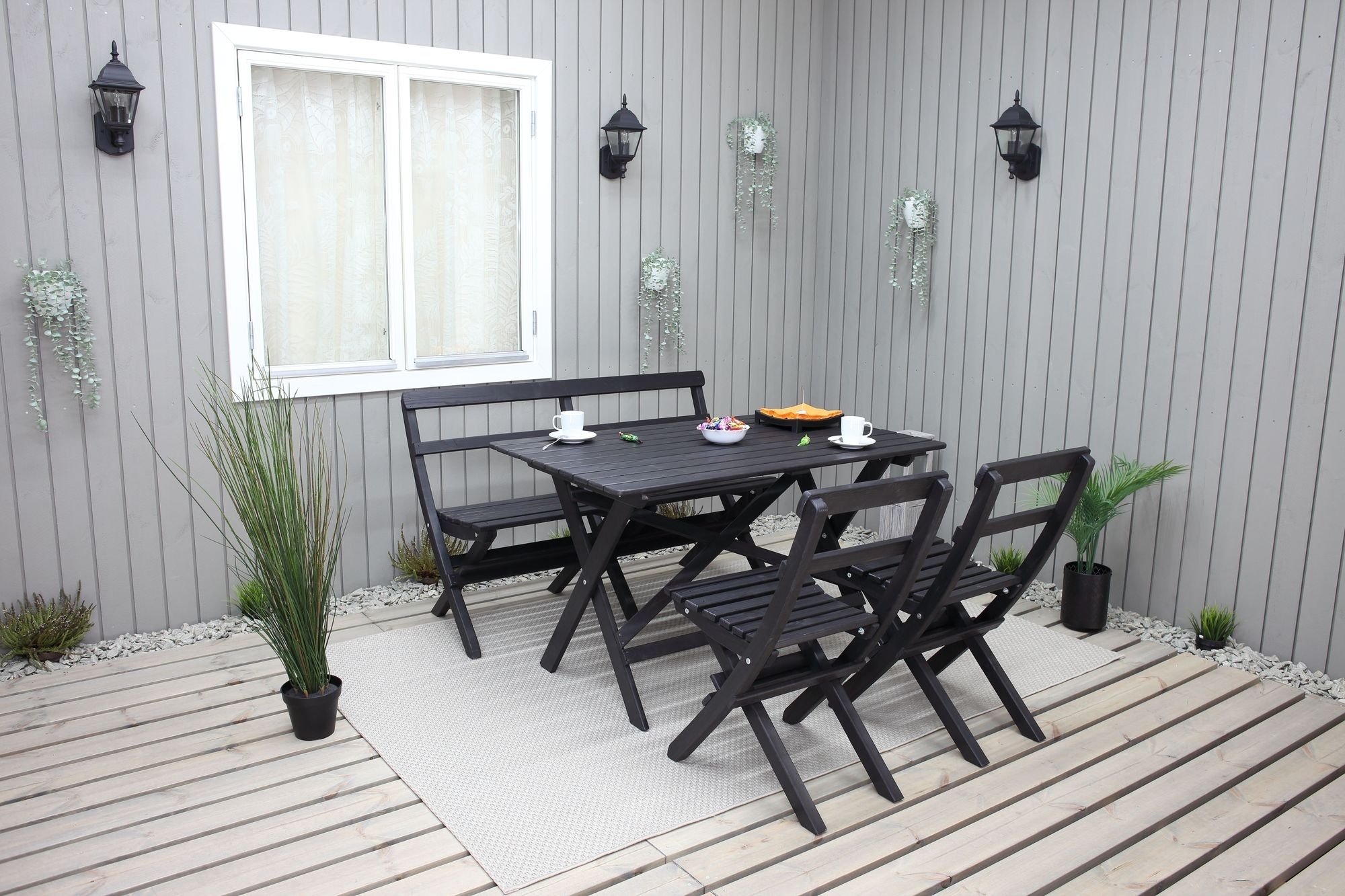 Klassisk spisegruppe i sortglasert tre til hagen. Settet er komplett med sofa, 2 stoler og bord. En utegruppe som passer godt inn i de fleste hager.
