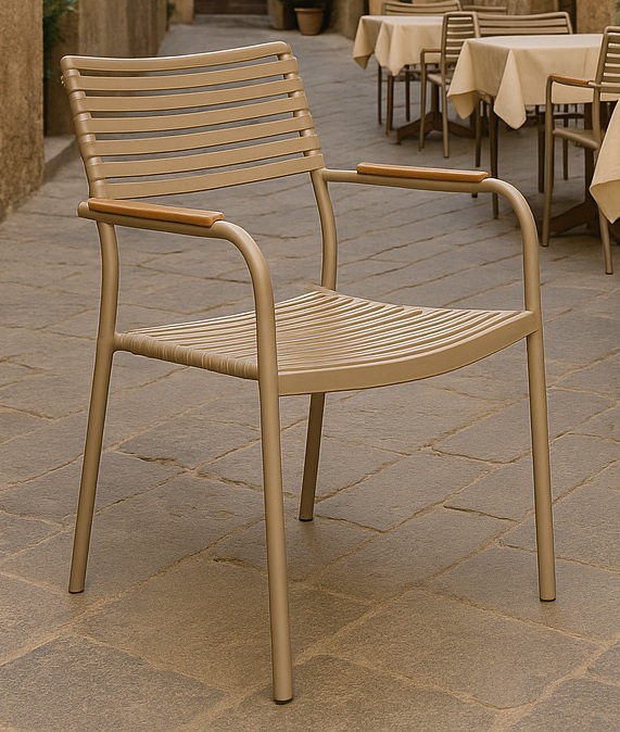 Stolene har et lett og fleksibelt design i beige lakkert metall med sete og ryggstøtte i slitesterk plast. Håndtakene har en dekorativ detalj i tre som bryter opp og skaper en mykere helhet. Stolene er stabelbare, noe som gjør dem enkle å sette bort når de ikke er i bruk.