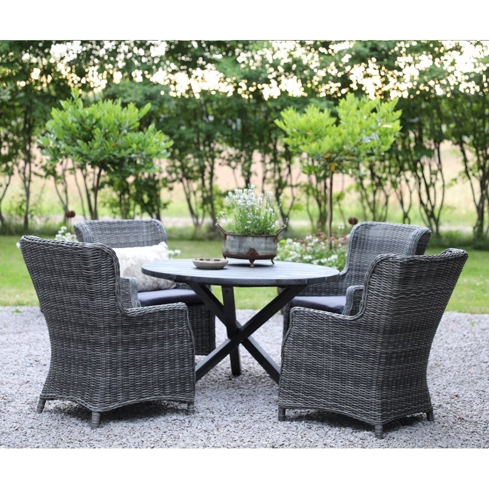 Spisegruppe til utemøbler fra Skånska Möbelhuset. Rundt bord i grålasert furu med kryssben med 4 stk. matchende Jacksonville lenestoler i grå kunstrotting med puter. En spisegruppe i harmoni der møblene går fint sammen og skaper en uovertruffen helhet som passer til både uterom og altan.
