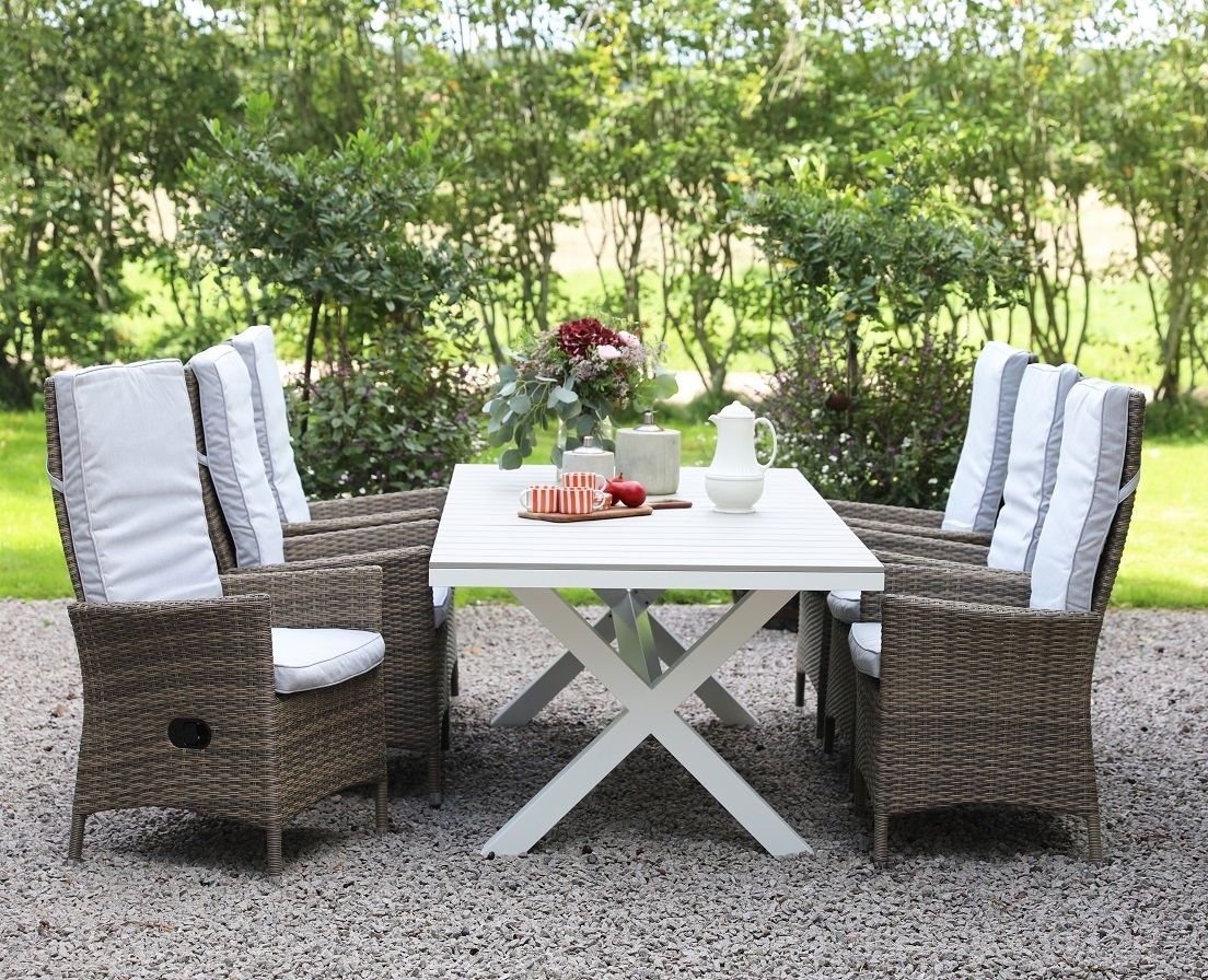 Spisegruppe med bord og 6 stoler. Stolene er laget av kunstrotting med aluminiumsramme.