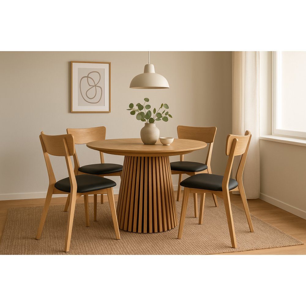 Spisegruppe Osaka Ø120-200 cm eik med 4 Amino-stoler i eik og svart øko-skinn