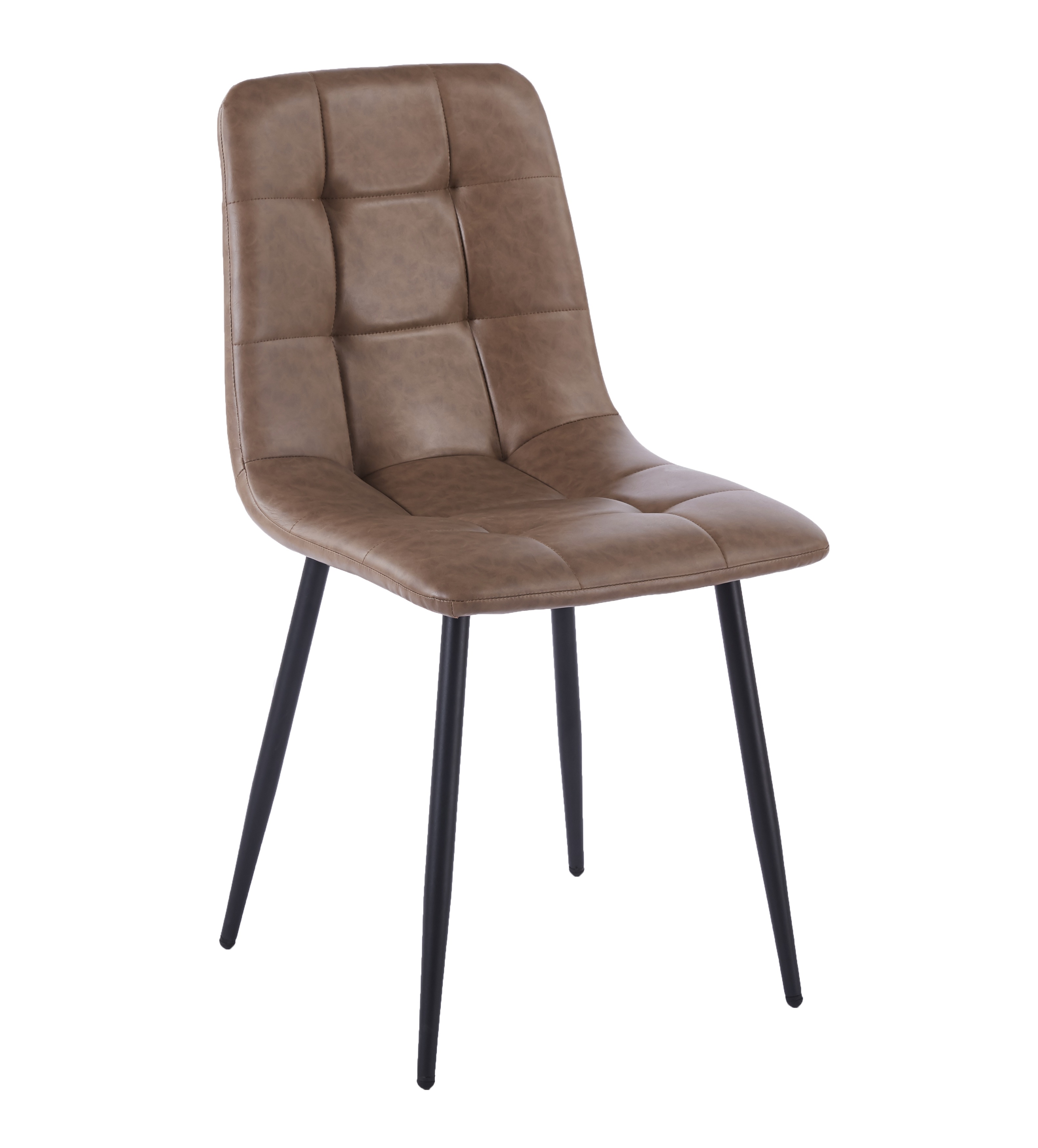 Bordet matches med fire Delta-spisestoler i brunt vintage-imitasjonsskinn . Trekket har en vakker patinert overflate som gir en varm og innbydende følelse, mens de svartlakkerte metallbena tilfører en moderne kontrast og stabilitet. Kombinasjonen av det lyse bordet og de mørke stolene skaper en balansert helhet med både eleganse og karakter.