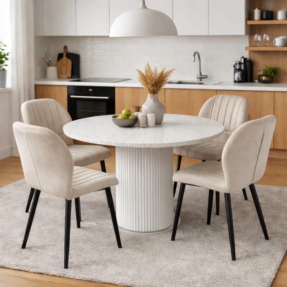 Spisegruppe Sandö spisebord Ø120 cm i hvit terrazzo med 4 Santos spisestoler i beige fløyel