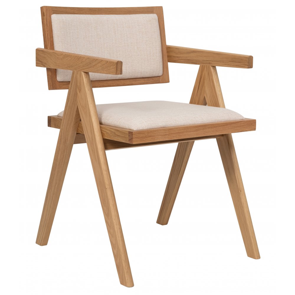 Sara lenestoler kompletterer bordet med sin klassiske form og naturlige uttrykk. Den solide rammen av FSC-sertifisert eik sammen med det lette lintrekket skaper en balanse mellom komfort og eleganse. Stolen har et komfortabelt sete, og de rene linjene gjør at den passer perfekt til den runde formen på Sumner-bordet.