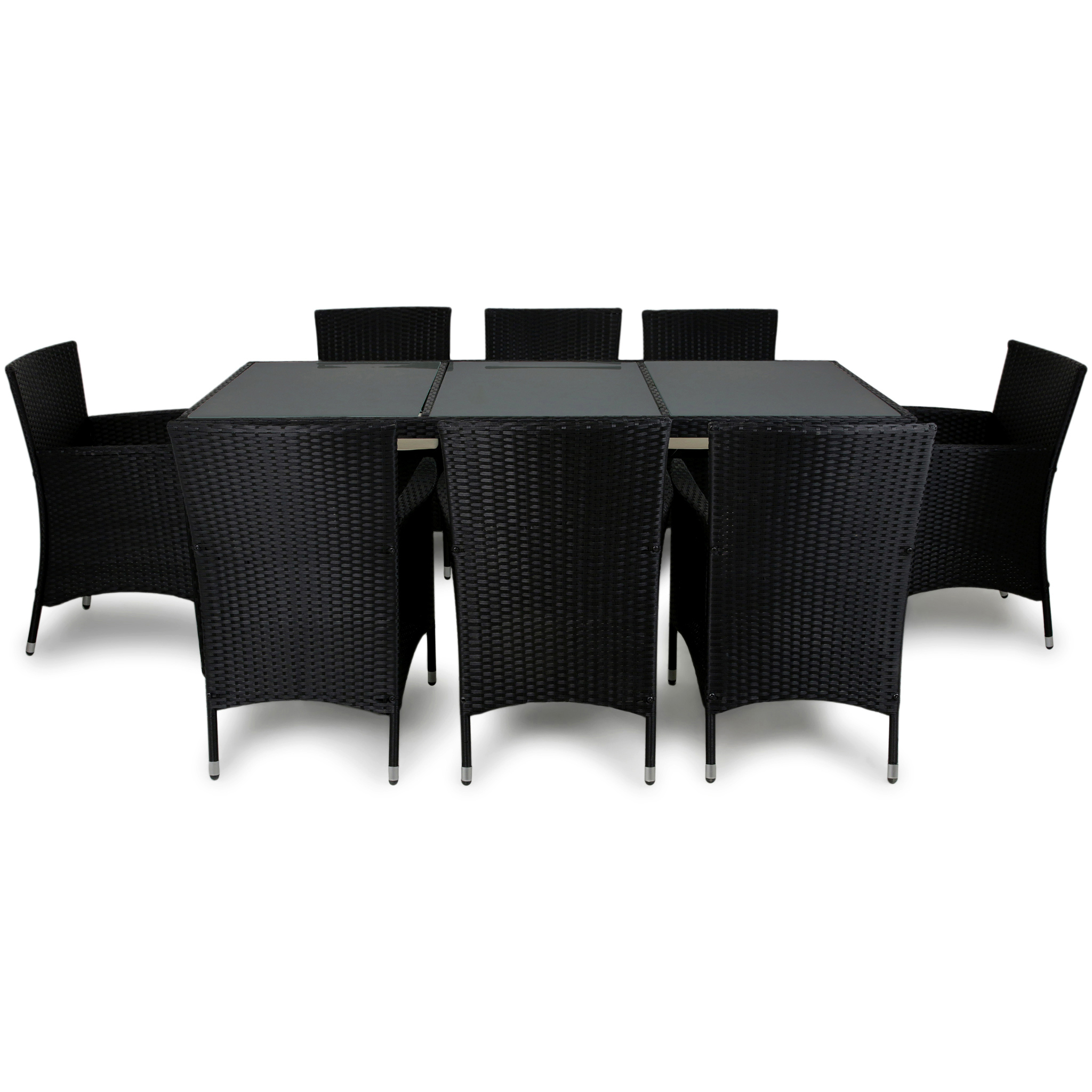 Romslig spisesett for hagen eller uteplassen med plass til åtte personer. Gruppen består av et langt rektangulært bord med sort glassplate i tre seksjoner, og åtte stoler i tett håndvevd syntetisk rotting. Designet er nøkternt sort og passer både moderne og klassiske utemiljøer.