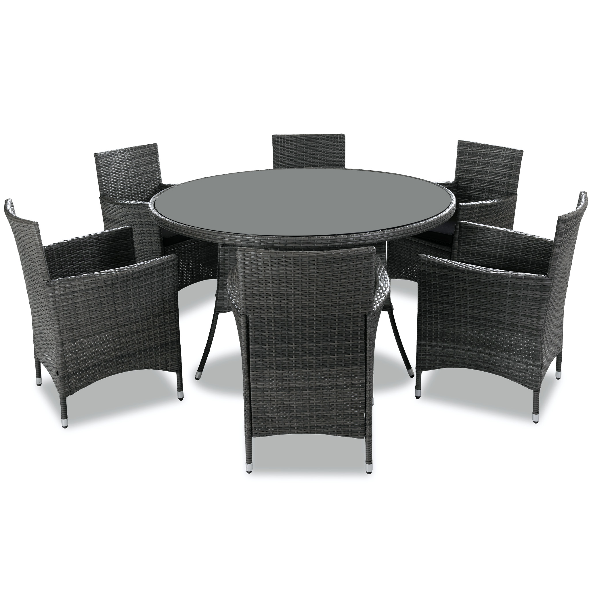 Et rundt spisestuesett i tett håndvevd syntetisk rotting, designet for å skape en koselig og sosial plass på terrassen eller i hagen. Gruppen består av et bord med rund glassplate og seks stoler med komfortable armlener.