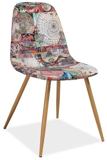 En koselig spisestol med et stilrent design. Understellet er produsert av metall med en herlig eikeutførelse og setet er kledd med et meget behagelig mønstret stoff for maksimal komfort.