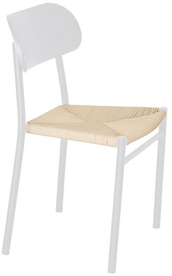 Spisestol med beige sete i naturfiber. Stamme i hvit metall.