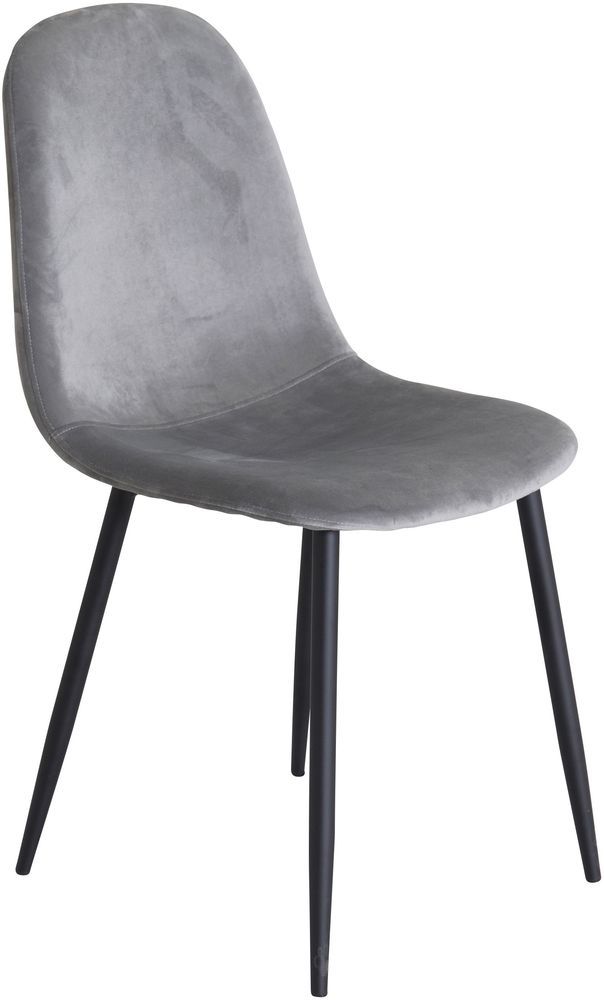 Spisestol kledd i lysegrå fløyel, 100% polyesterfiber. Sete og rygg er skumstoppet for god komfort. Ramme i svart metall.
