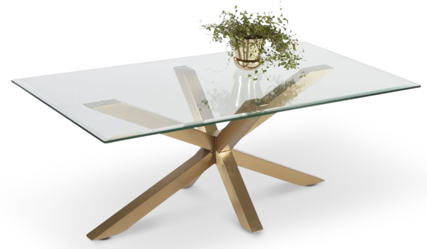 Et frekt sofabord med et annerledes design. Bordplate i transparent glass med understell i messing.