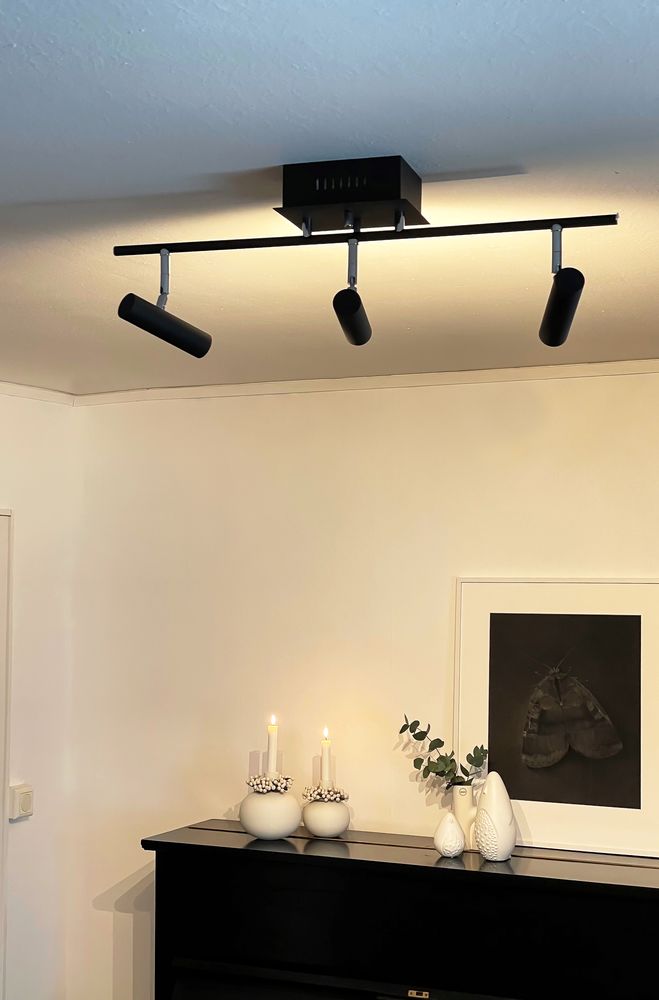 Spotlight i svart og stålfarget metall. Enkel å montere i taket.