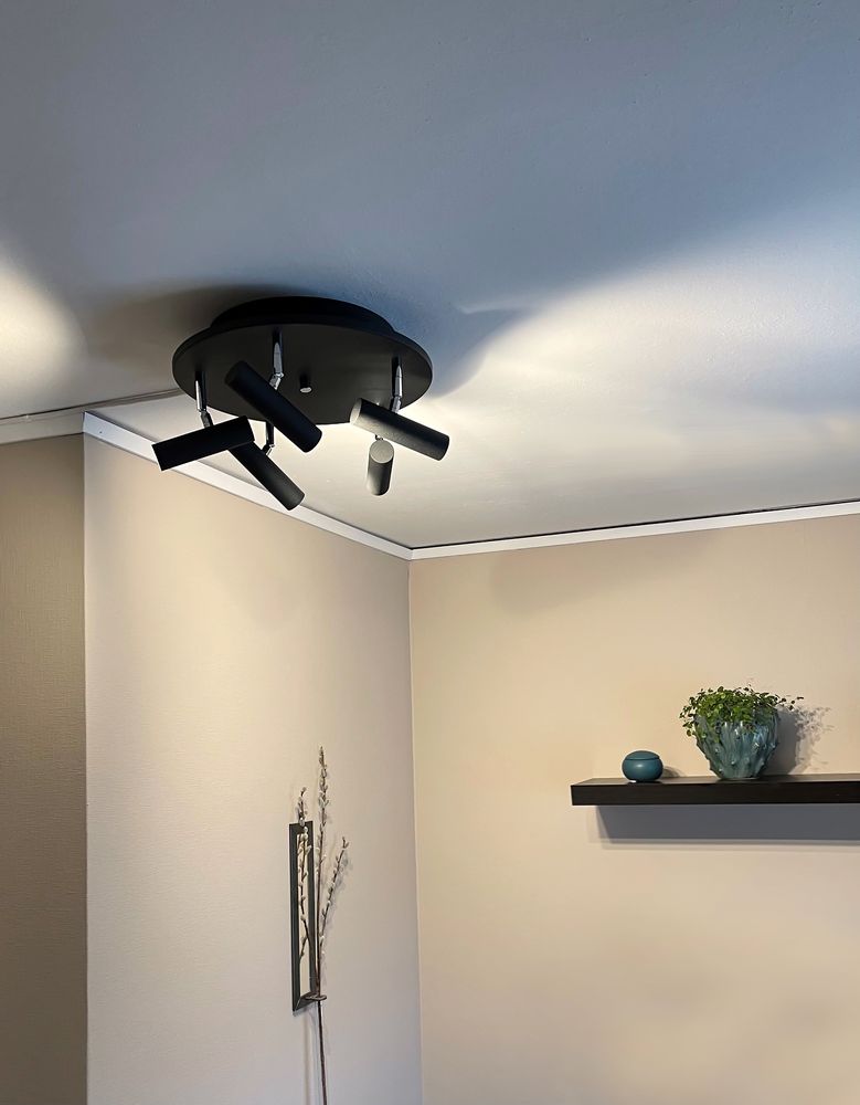 Spotlight i svart og stålfarget metall. Enkel å montere i taket.