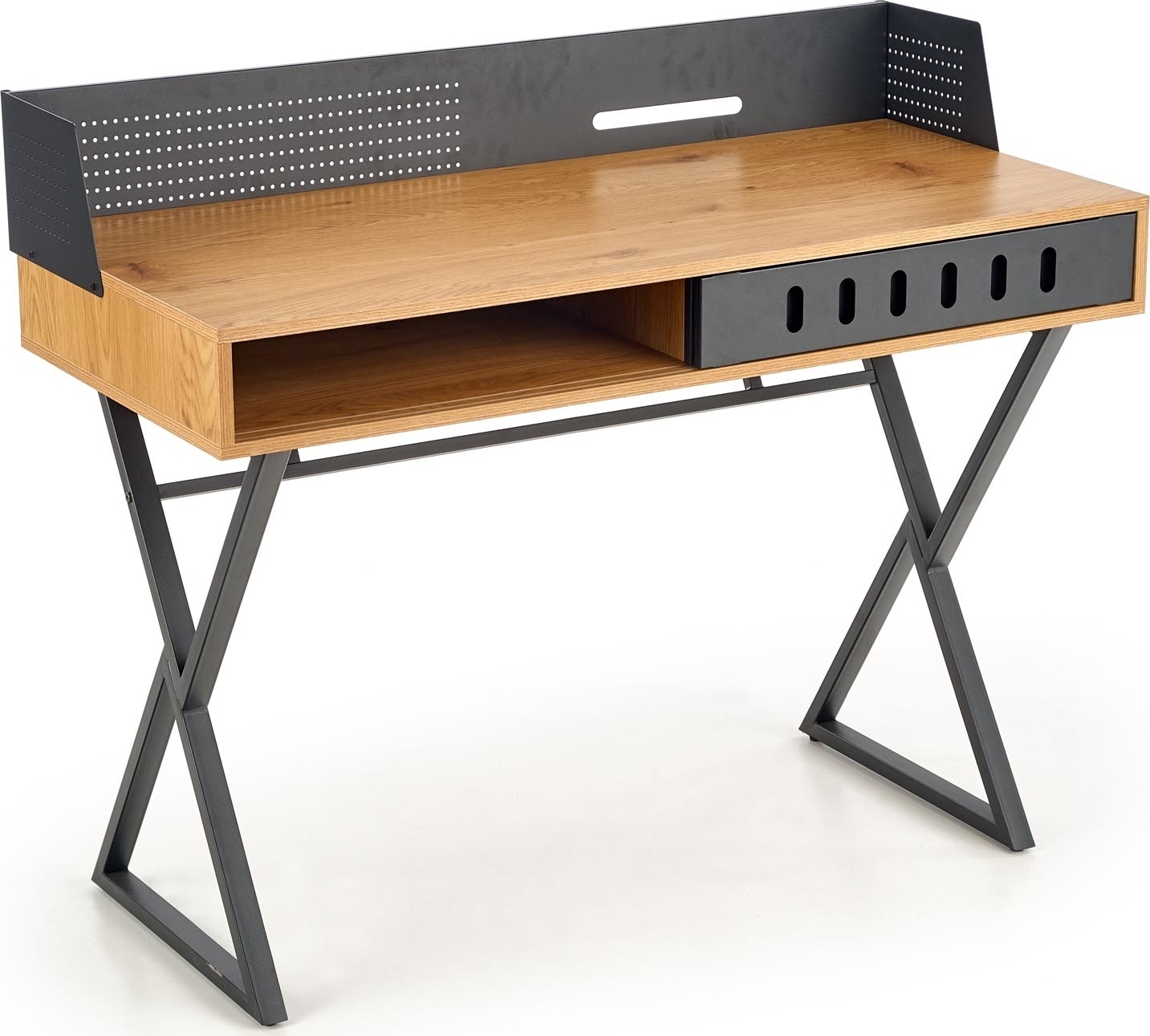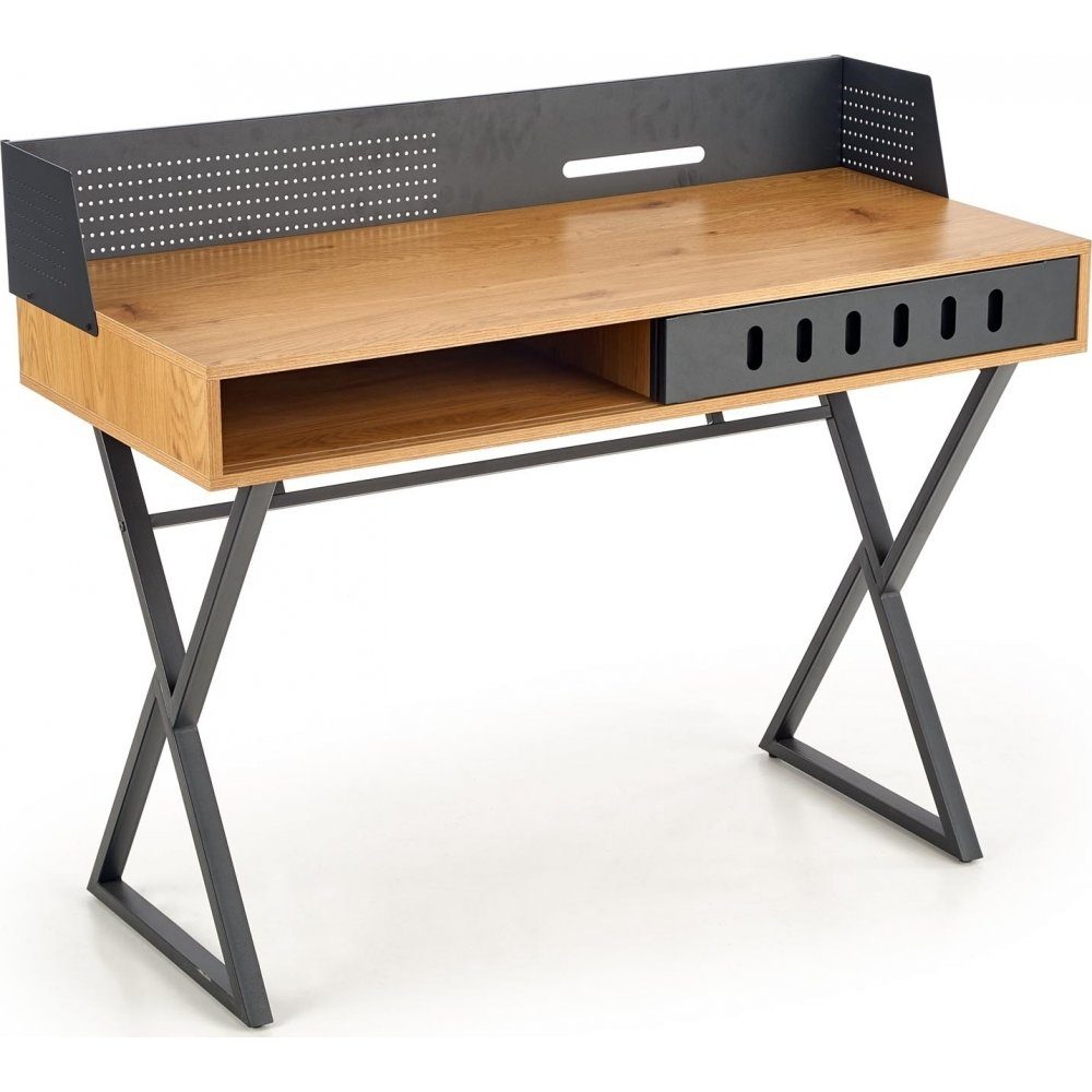 Et skrivebord som kombinerer funksjonalitet og design på en elegant måte. Bordplaten i treeffekt gir en varm og naturlig følelse, mens de sorte detaljene og de X-formede metallbeina tilfører et industrielt og moderne preg. Den praktiske designen byr på mange oppbevaringsmuligheter med en romslig åpning for tilbehør og en skuff med stilige utskjæringer for enkel organisering.