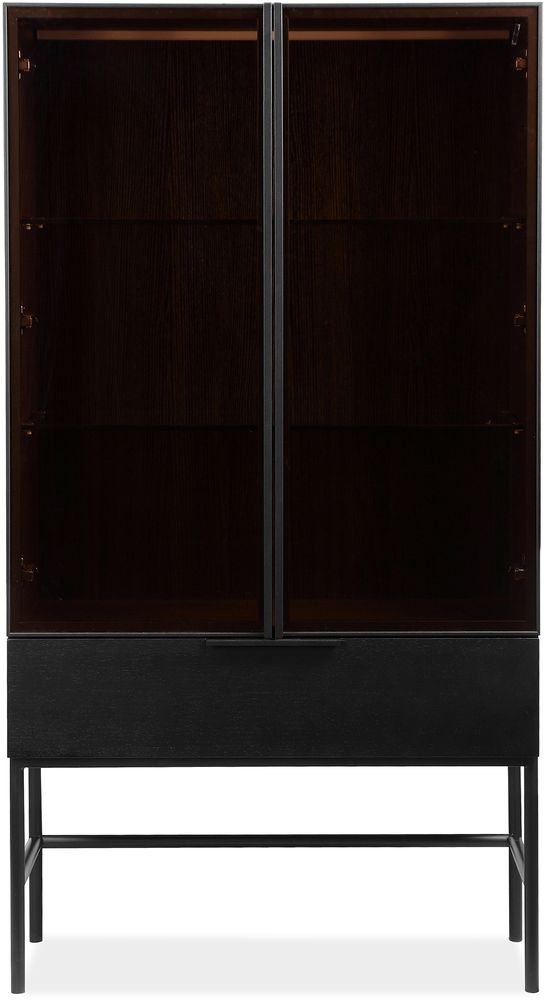 Vitrineskap med 2 dører i sotat glass, laget av askfinér med stamme i svart metall. Ledbelysning inne i skapet.
