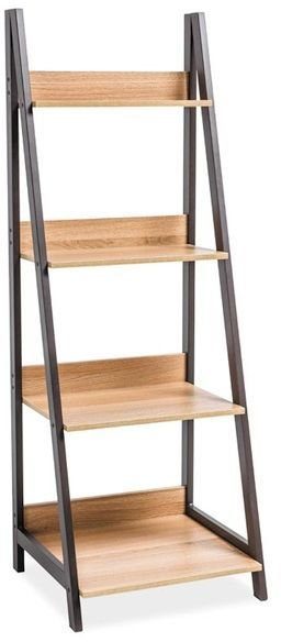 En flott stigehylle med et moderne design. Stammen er laget av mørkebrunt metall og hyllene er av MDF i en fin eikeutførelse.