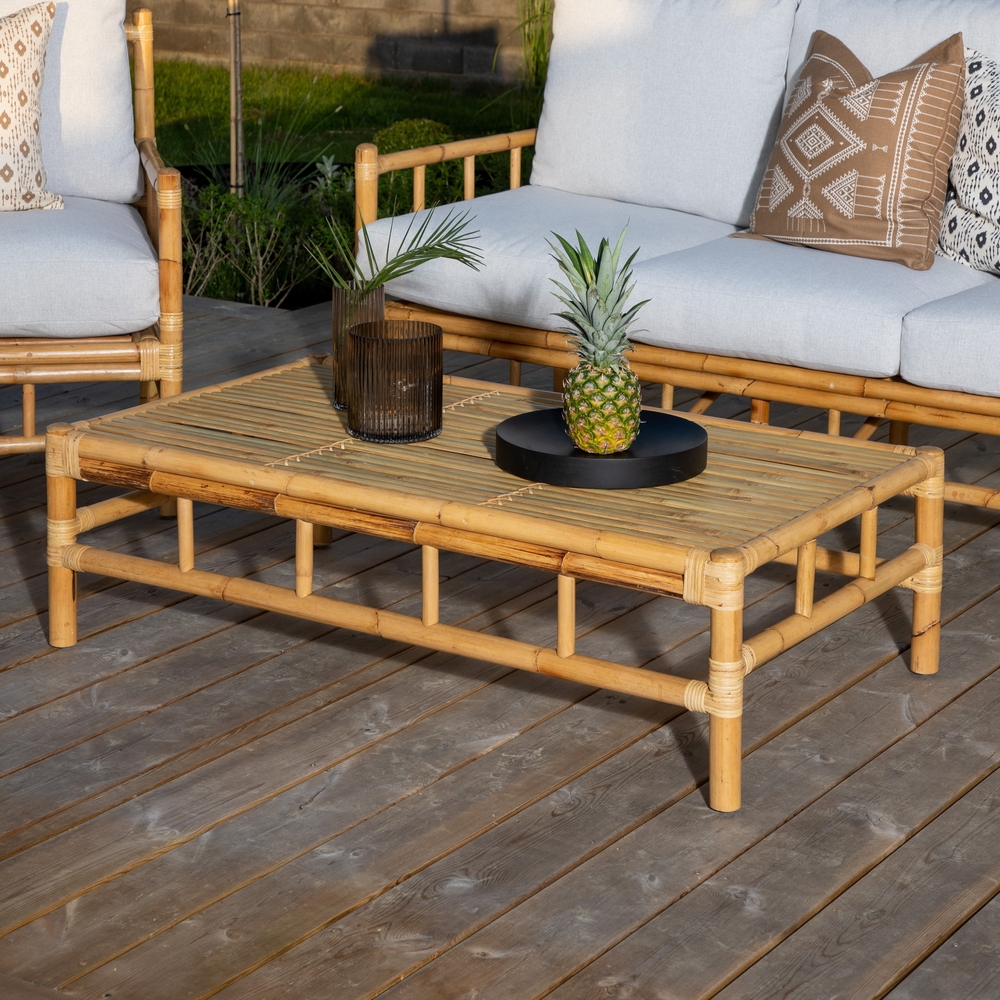 Cane salongbordet er perfekt for de som ønsker en følelse av natur på terrassen. Det rektangulære salongbordet er laget av bambus og rotting, som har sin naturlige farge i en trendy beige og brun farge. Pynt med lyslykter og vaser for å fullføre dekoren. Plasser salongbordet sammen med sofaen og lenestolen i samme serie og du er helt klar for de vakre sommerdagene!