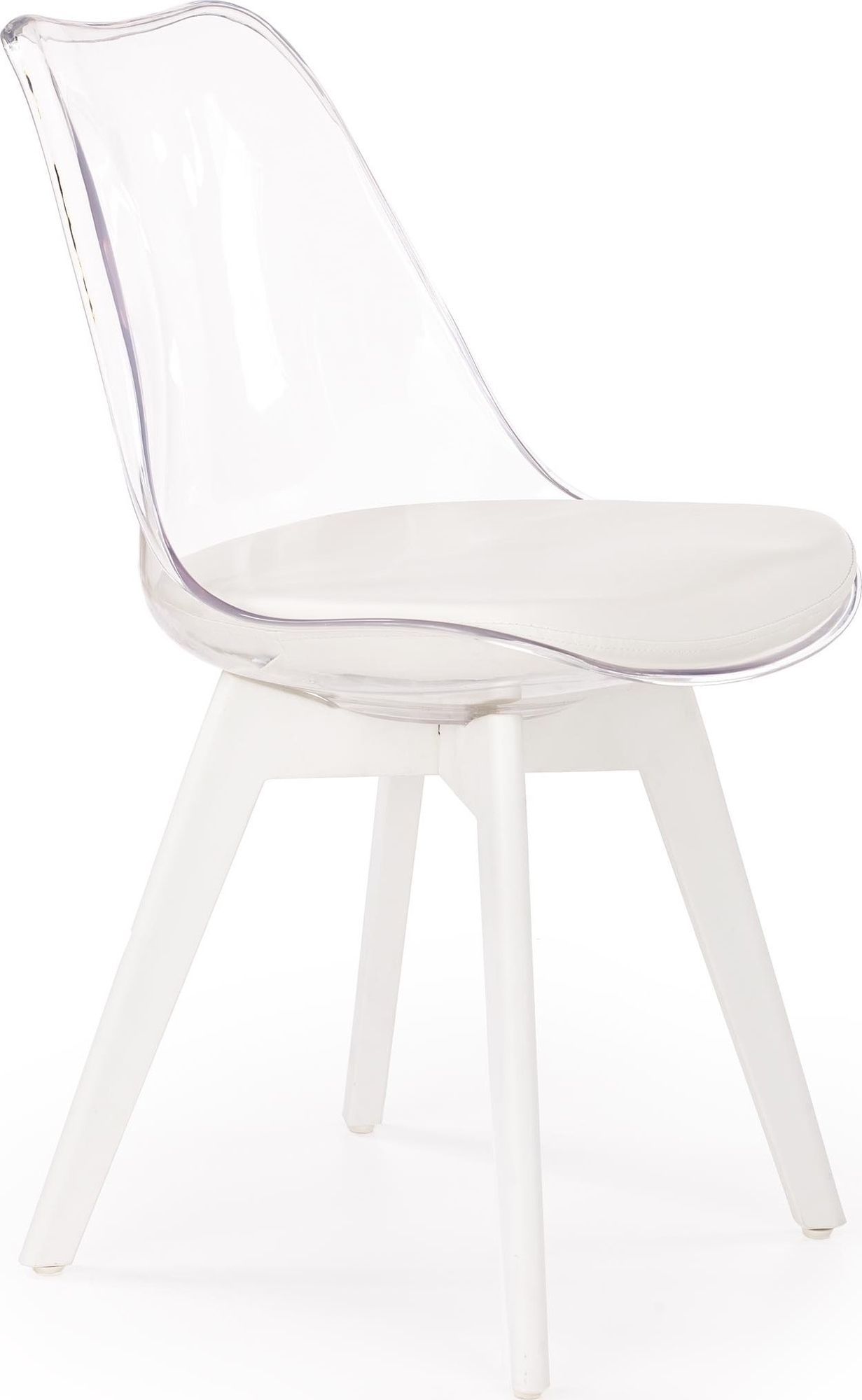En unik spisestol med et moderne design. Understellet er produsert av hvitmalt bøk og setet er av transparent plast med en meget behagelig setepute for maksimal komfort.