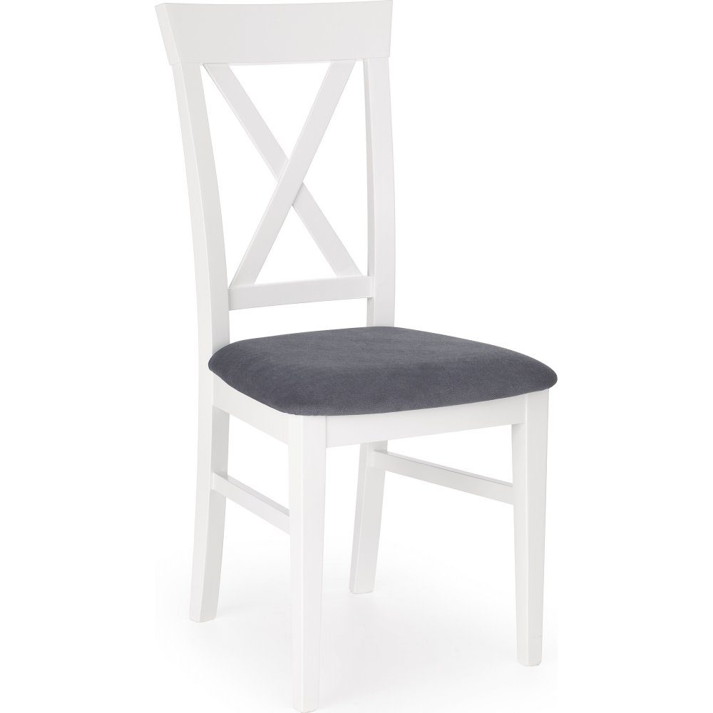 En elegant spisestol med et klassisk design. Understellet er produsert av hvitmalt massiv bøk og setet er kledd med et meget behagelig blått stoff for å få den maksimale komforten.