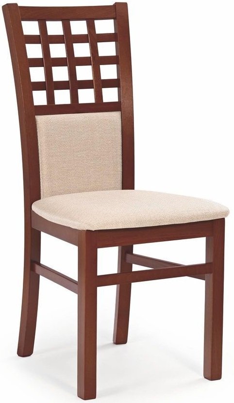 En klassisk spisestol med en stilfull design. Tilvirket i massiv bøk med en herlig kirsebær utførelse og setene er trukket med et veldig behagelig beige tøystoff for maksimal komfort.