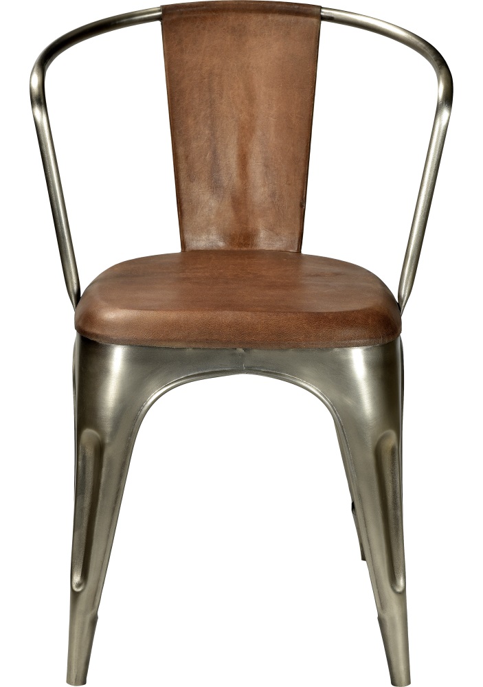 Frekk og robust stol i metall / skinn med en vintage stil. Stolen kan stables når den ikke brukes for enklere oppbevaring.