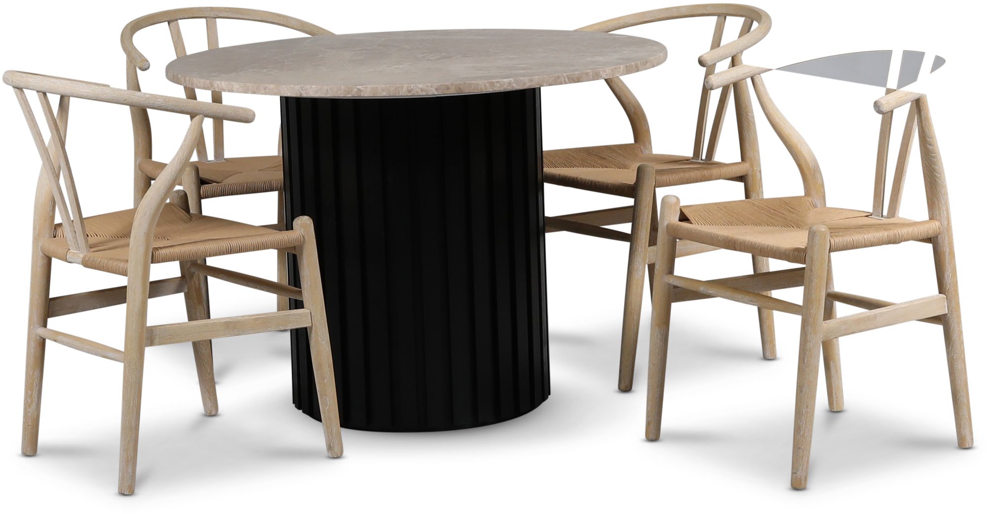 Sumo spisegruppe Ø105 cm inkl. 4 stk. Brandon spisestoler whitewash - Svartbeiset / Beige Empradore + Møbelføtter