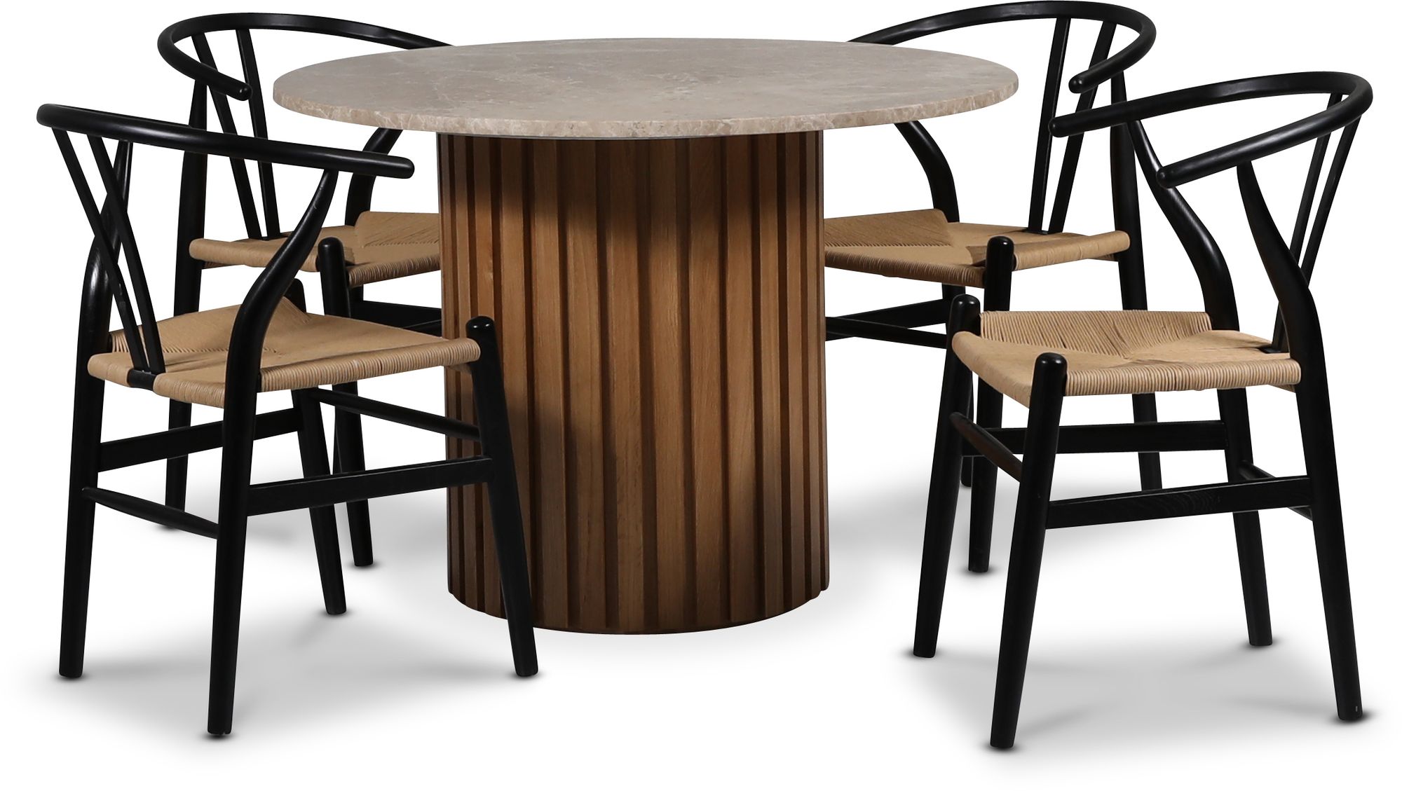 Sumo spisegruppe Ø105 cm inkl. 4 stk. Brandon svarte spisestoler - Oljet eik / Beige Empradore