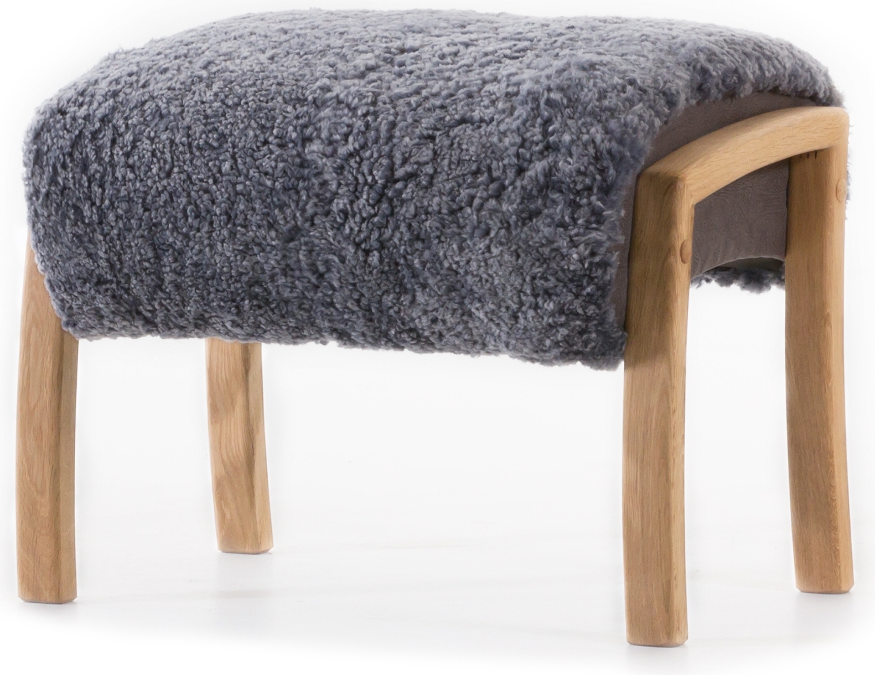 Sune fotskammel i grått ekte saueskinn med massive bein i oljet eik.