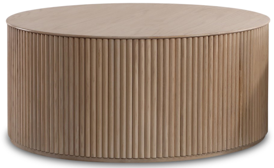 Prydelig og romslig sylinderformet salongbord, laget av solide eikestaver og en solid kantlist, topplate av finér i whitewash.
