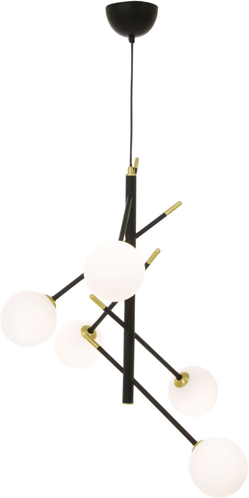 Taklampe i svart metall med detaljer i svart messing. Glasskupler i opalhvit. Henges lett opp i taket.