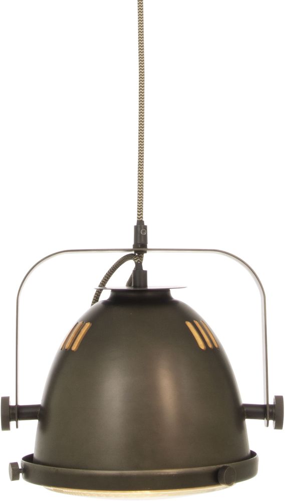 Taklampe i jerngrått metall med detaljer i tre. Lett oppheng i taket.