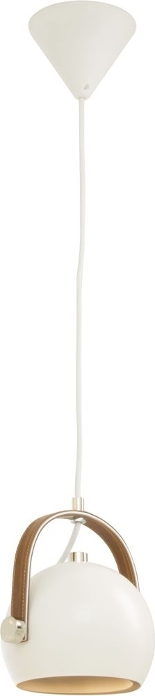 Taklampe i hvitt metall med detaljer i kunstlær. Lett oppheng i taket.