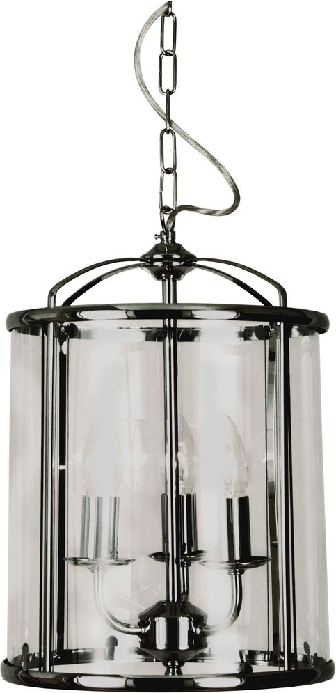 Taklampe i metall med forkrommet design og klart glass. Lett oppheng i taket.