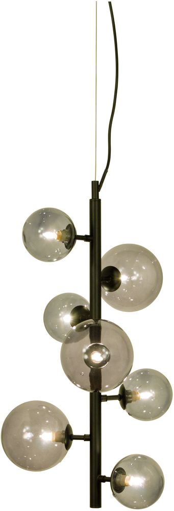 Taklampe i svart metall med 6 lyskilder i røykgrå glasskupler. Henges enkelt opp i taket.