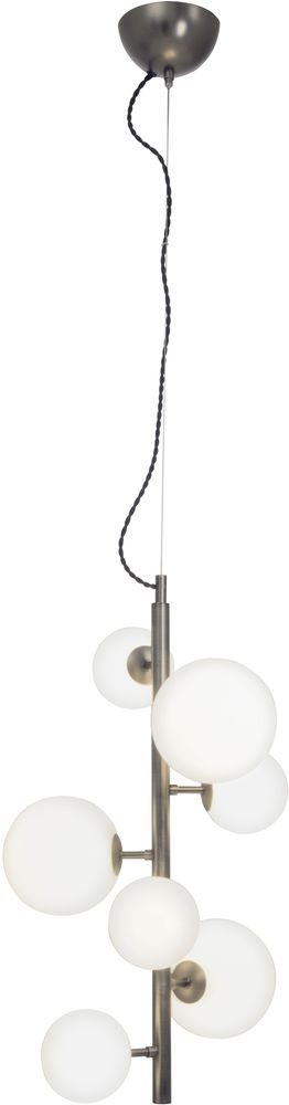 Taklampe i metall i tinnutførelse, med 6 lyskilder i opalhvite glasskupler. Henges enkelt opp i taket.