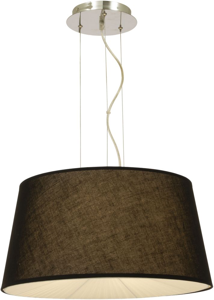 Taklampe med svart tekstilskjerm. Plate i forkrommet metall. Lett oppheng i taket.