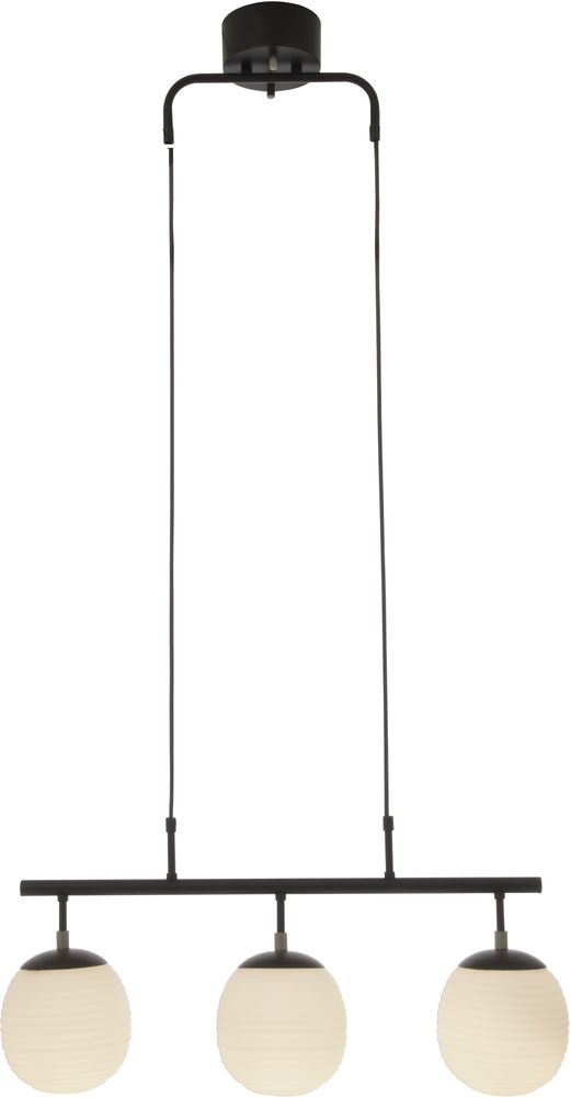 Taklampe i svart metall og opalhvitt glass. Henges enkelt opp i taket.