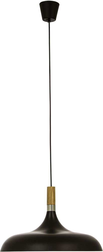 Taklampe i svart metall med tredetaljer. Lett oppheng i taket.