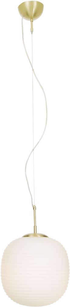 Taklampe i metall i matt messingutførelse og opalhvitt glass. Henges enkelt opp i taket.