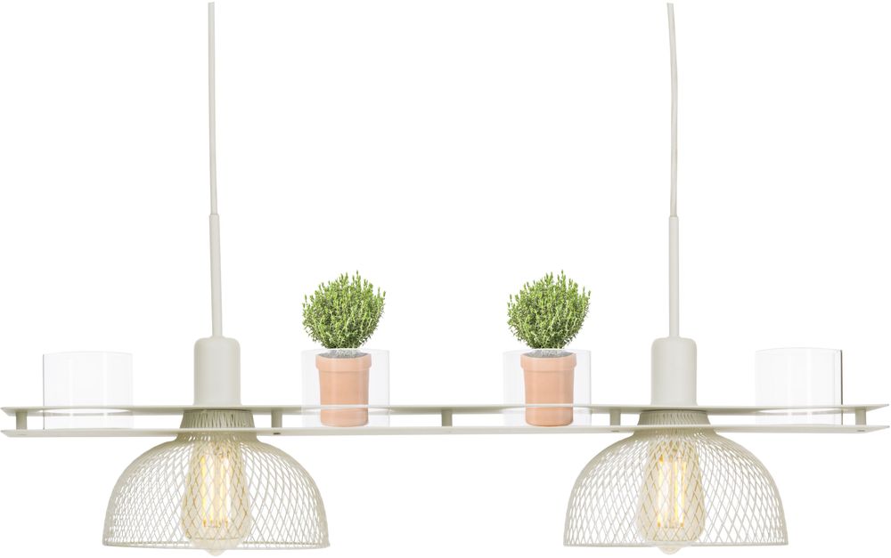 Taklampe i hvitt metall og klart glass. 4 stk. glassbeholdere for dekorasjoner. Henges enkelt opp i taket.