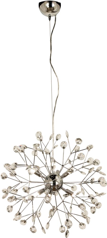 Taklampe i forkrommet metall med krystalldetaljer. Lett oppheng i taket.