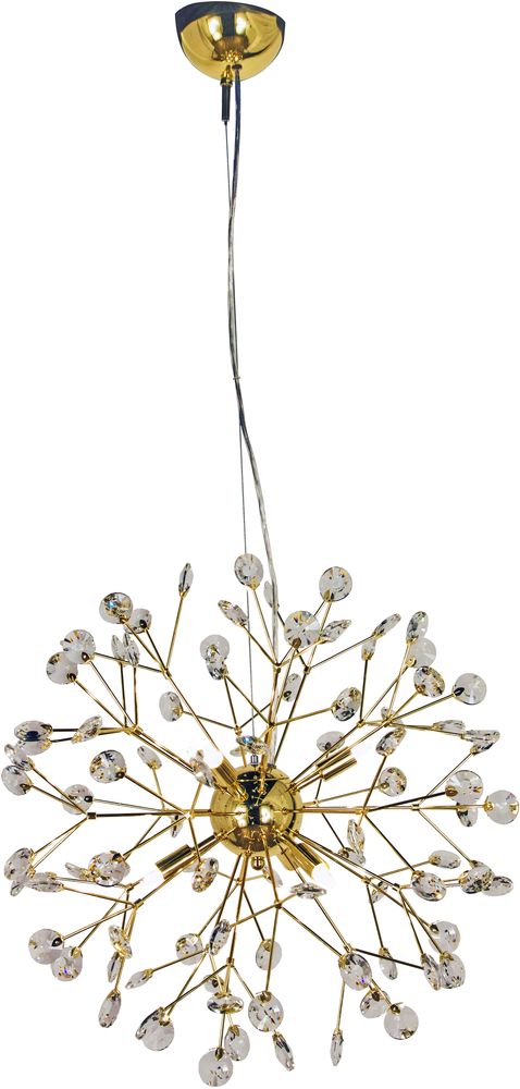 Taklampe i metall med messingdesign og krystalldetaljer. Lett oppheng i taket.