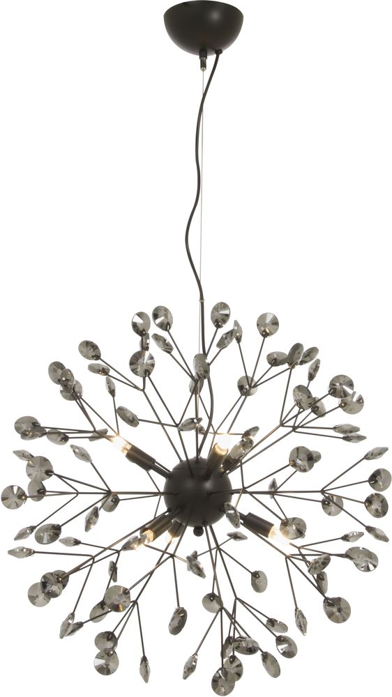 Taklampe i svart metall med krystalldetaljer. Lett oppheng i taket.