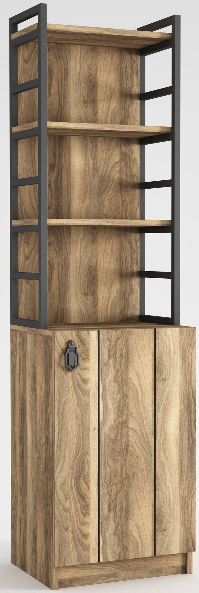 Bokhylle laget av melaminbelagt sponplate og metall.