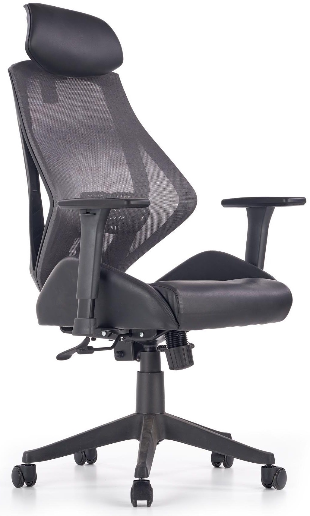En herlig Kontorstol med moderne design. Kontorstolen er tilvirket av metall og plast med en veldig behagelig kledning av kunstskinn og mesh stoff. Setehøyde er lett justerbar med hjelp av spaken under setet, i tillegg setets vinkel, armstøtte, ryggstøtte og nakkestøtte er justerbart og stolen er lett å forflytte takket være hjulene under stjernefoten.