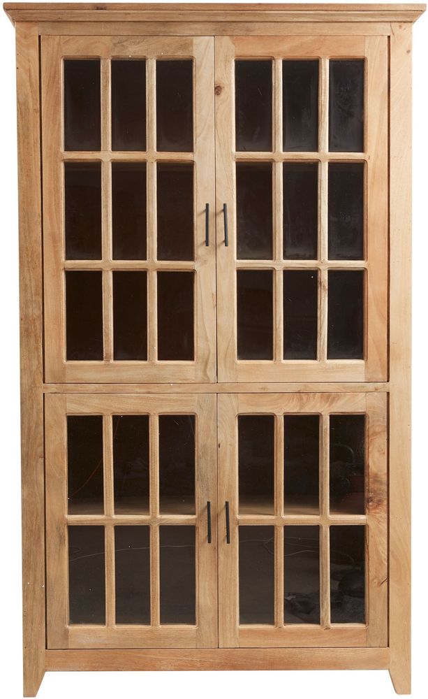 Romslig skap av tre med glassdører i gammeldags stil med sotet glass. Inndelt i en øvre og nedre del med to dører til hver. Laget av mangotre.