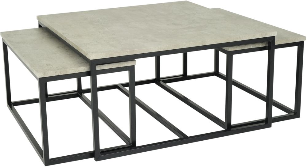 Thorborg salongbord i sett om 3 bord, er større og 2 mindre som enkelt kan oppbevares under det større bordet. Topplate av laminert MDF med mønster av betong, stamme av svart metall.