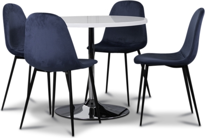 Spisegruppe fra Skånska Möbelhuset, Tiana spisebord 90 cm i diameter med hvit høyblank bordplate. Inkludert 4 stk. matchende Carisma fløyelsstoler i blå fløyel med svarte bein.