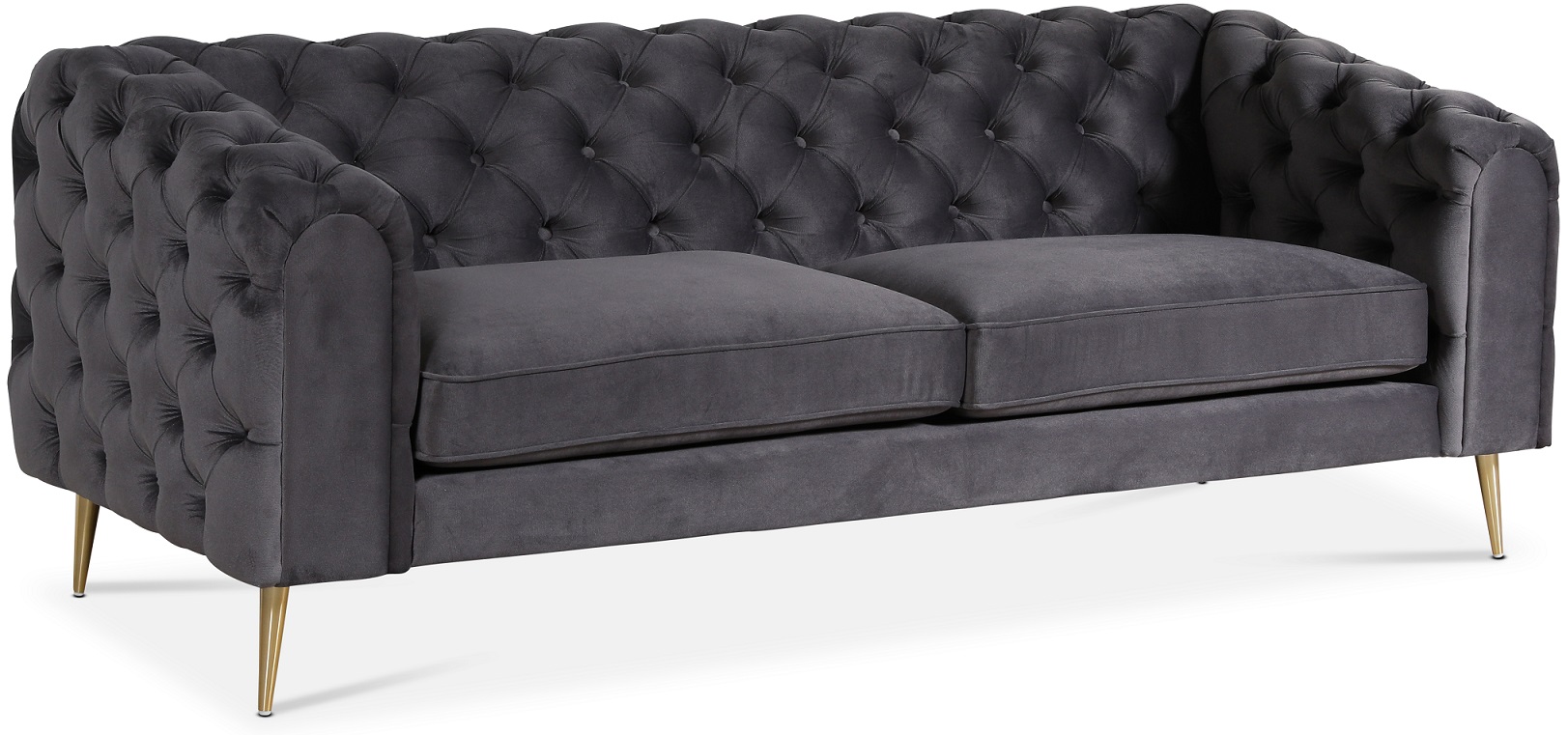 Tiffany 3-seters chesterfield sofa i en myk antrasittfarget fløyelsaktig stoff. Tiffany er en modernisert chesterfield sofa som passer både i moderne og klassiske stuer. Vendte metallben i messing.