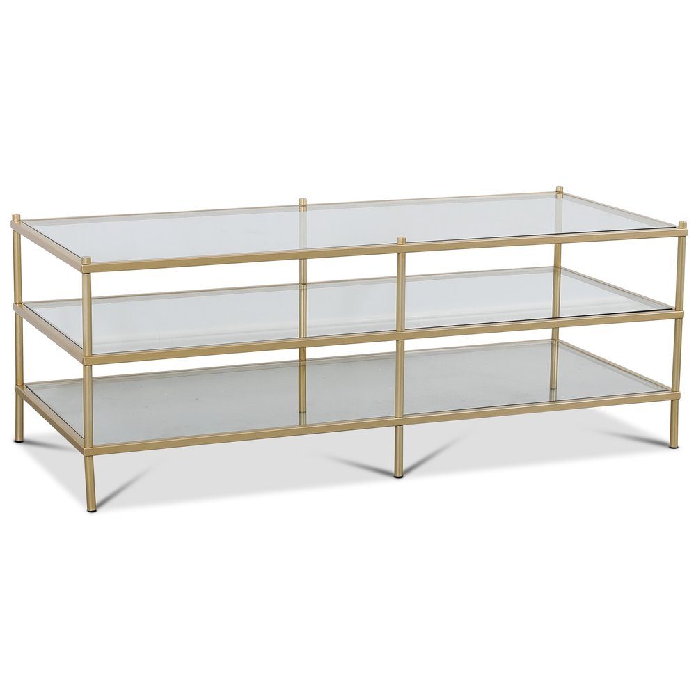 Art Deco er en luksuriøs stil som kom i begynnelsen av 1900-tallets glamour i New-York. Tiffany Inca er et rektangulært sofabord i messing med herdet glass i tre plan. Bordet er gjennomført med nedsenkete glassplater i metallrammen for å få et solid inntrykk.